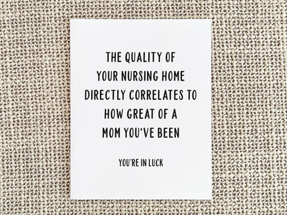 When you choose one of our Mother's Day cards, you're not just picking up a greeting cardâ you're choosing a keepsake that will remind her of your love and appreciation. Printed on high-quality matte cardstock, our cards are as durable as they are funny, making them the perfect combination of style and substance. The blank inside allows you to add your own personal message, whether you want to keep the jokes rolling or add a heartfelt touch.
